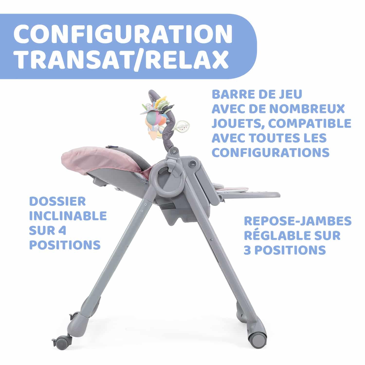 Très pratique pour les parents, Polly Magic Relax offre une solution idéale pour la détente et pour le repas. Elle peut en effet être utilisée dès la naissance dans la configuration transat puis comme chaise haute de 6 mois à 3 ans avec ou sans tablette.