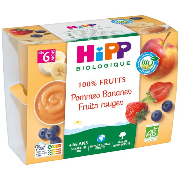 Hipp 100% Fruits Pommes Bananes Fruits rouges dès 6 Mois offrent à votre bébé ce que la nature a de meilleur avec :