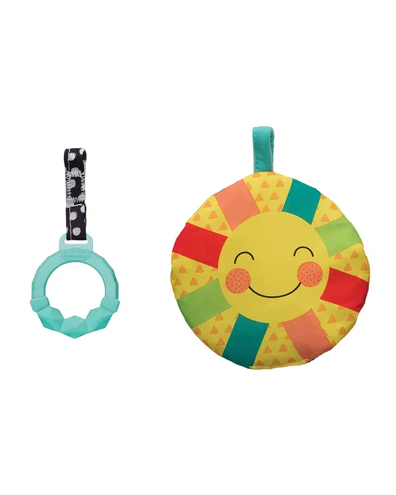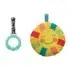 2 jouets amovibles et repositionnables : miroir qui éveille la curiosité de bébé et anneau de dentition en forme de bouton, en silicone souple.