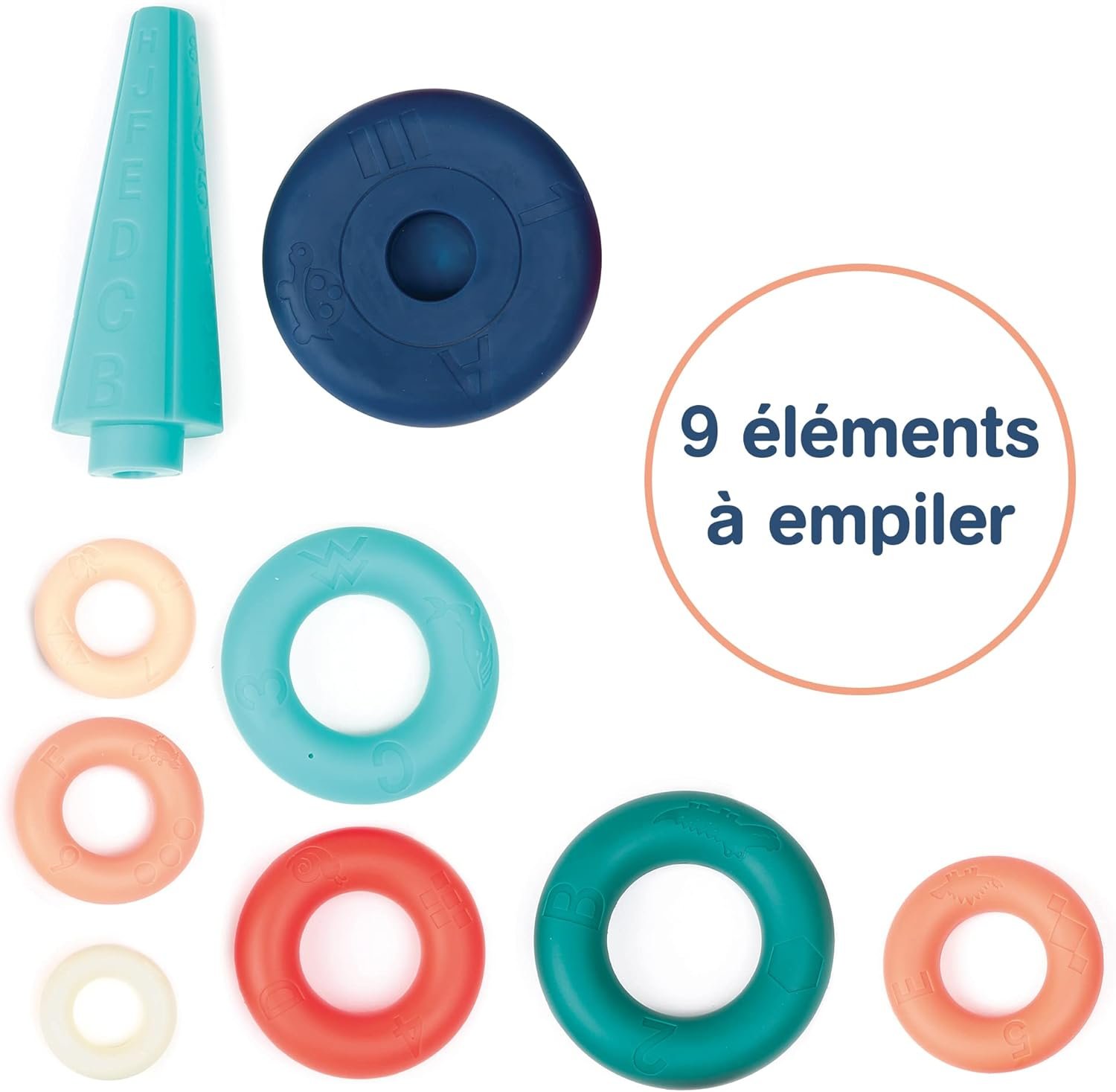 En manipulant les anneaux, les enfants découvriront des motifs gravés tout autour : lettres, animaux, chiffres, formes.