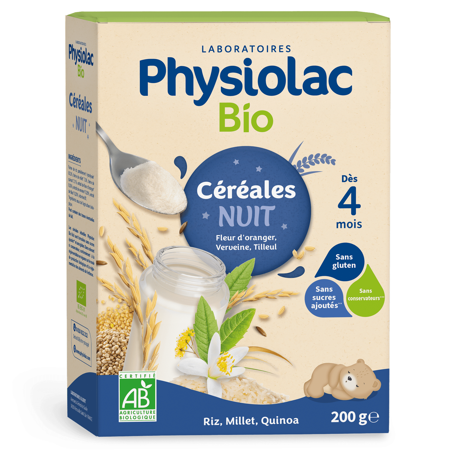 Les céréales infantiles Physiolac Bio Nuit sont principalement composées de riz, millet et quinoa. Elles sont certifiées Agriculture Biologique.